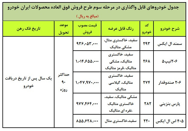 به اطلاع کلیه مشتریان محترم و نمایندگی هاي مجاز می رساند شرکت ایران خودرو در راستاي پاسخ به نیاز بازار خودرو مرحله سوم طرح فروش فوق العاده محصولات خود را اجرا خواهد نمود. متقاضیانی که در طرح هاي قبلی انتخاب نشده اند می توانند در این طرح با شرایط ذیل بدون نیاز به دریافت مجدد کد کاربري و کلمه عبور ثبت نام نمایند. در این طرح قیمت قطعی بوده و موعد تحویل خودروها حداکثر 3 ماهه خواهد بود.
