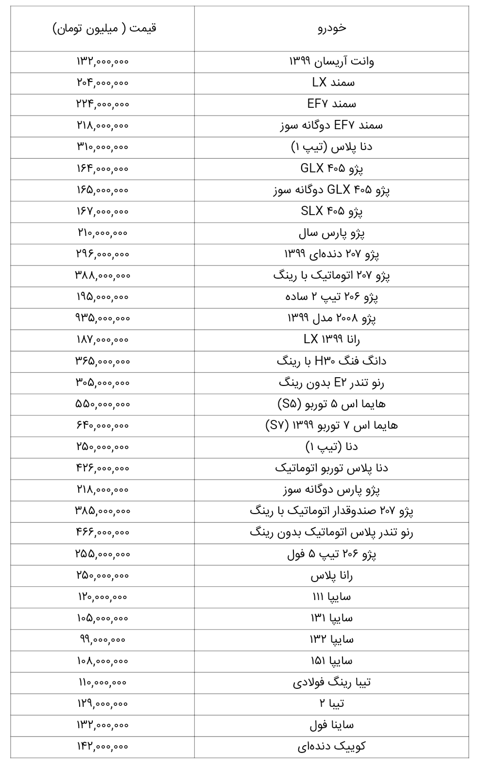 آخرین قیمت اعلامی برخی خودروها در بازار