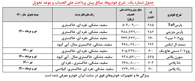 نکته1 :انتخاب شدگان درطرحهاي قبلی که موفق به واریز وجه نشده اند نیز، میتوانند با مراجعه به سایت فروش اینترنتی محصولات ایران خودرو، نسبت به انجام مجدد ثبتنام اقدام نمایند.