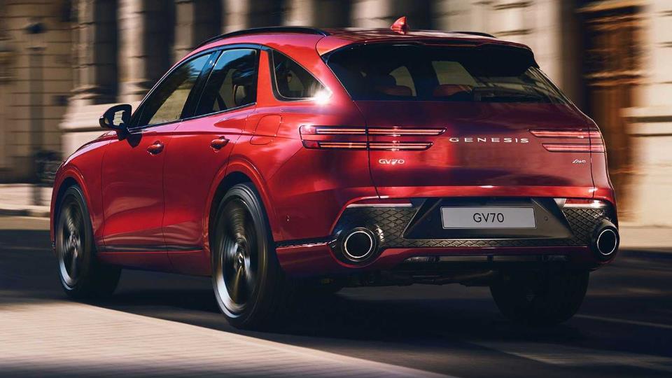 الگوی چراغهای دوبخشی و جلوپنجره با فرمی خاص به عنوان بخشی از زبان طراحی محصولات جنسیس در جلو و عقب بدنه حضور داشته هرچند با توجه به شکل ستون C و خروجیهای جالب توجه اگزوز، طرح GV70 اسپرتتر از برادر بزرگتر از کار درآمده است. البته جنسیس همزمان نسخه اسپرت این خودرو با جزئیات تیره بدنه، رینگهای اسپرت و خروجیهای بیضی شکل اگزوز را نیز معرفی کرده است.