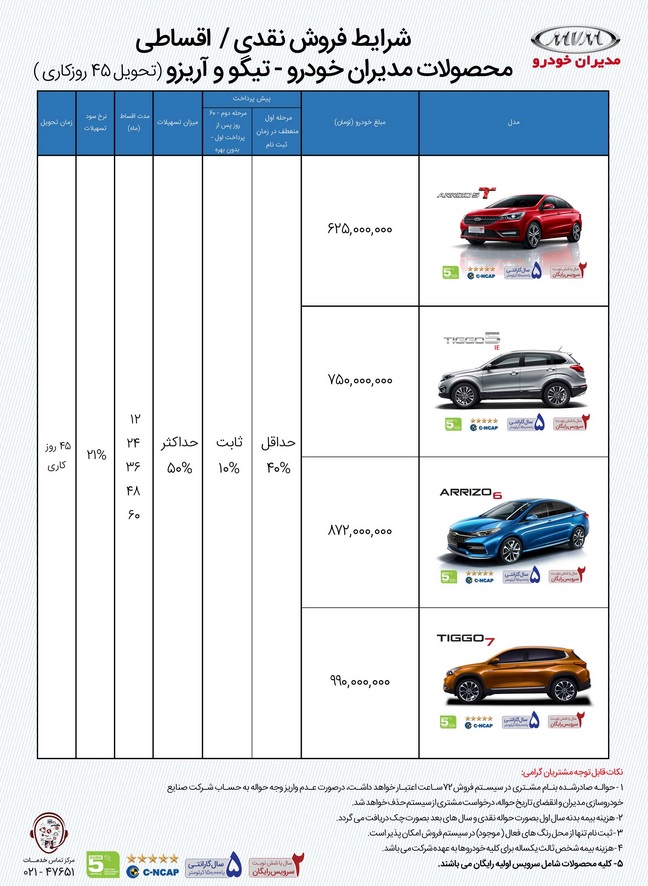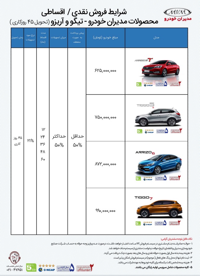 طرح جدید فروش محصولات چری شرکت مدیران خودرو ویژه تیرماه 99 منتشر شد. تحویل محصولات مدیران خودرو 45 روزه اعلام شده است و در خرید اقساطی بازپرداخت 12 تا 60 ماهه برای خریداران تعریف شده است.