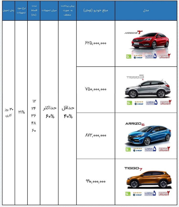 در شرایط فروش محصولاتی همچون چری آریزو 5 توربو با قیمت 625 میلیون تومانی، چری تیگو 5 اکسلنت با قیمت 750 میلیون تومانی، چری آریزو 6 با قیمت 872 میلیون تومانی و خودروی چری تیگو 7 با قیمت 990 میلیون تومان ثبت سفارش می شود و همانطور که گفتیم، مشتریان می توانند با پرداخت حداقل 40 یا 50 درصد قیمت خودرو هنگام ثبت نام، مابقی آن را در قالب اقساط 12، 24، 36، 48 و 60 ماهه پرداخت کنند که جزییات آن را می توانید در جدول زیر شاهد باشید.